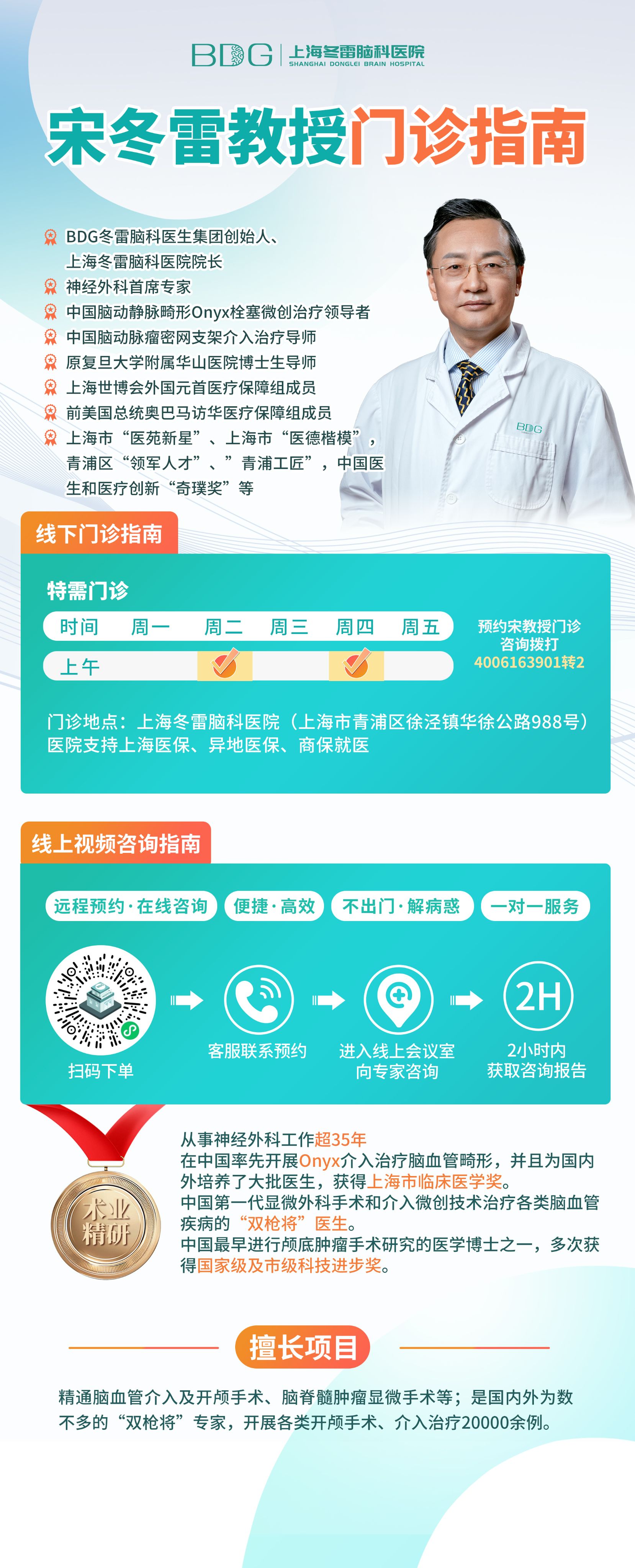 医院由原华山医院神经外科主任医师、原复旦大学博士生导师宋冬雷教授发起创办,汇聚国内著名三甲医院,如复旦大学附属华山医院、